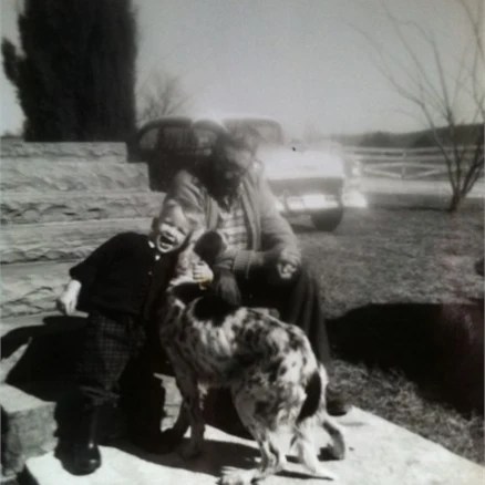 The founder’s son and current CEO, wearing large rubber boots and hugging a bird dog, seated next to his grandfather, on the back steps of the rock house his grandfather built circa 1940 and featured above.